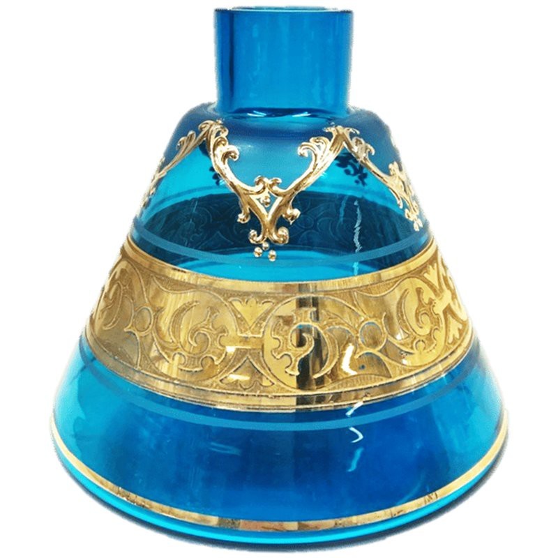 Preciosa base para cachimba tradicional modelo Aswad color Turquesa de El Nefes.Su cristal de bohemia es de muy alta calidad, los grabados de color dorado estan realizados a mano con una precisión exacta, dándole un aspecto original y lujoso.Este articulo lleva un sello "El Nefes" que certifica la originalidad de este producto.Medidas:
