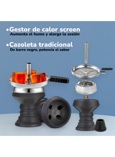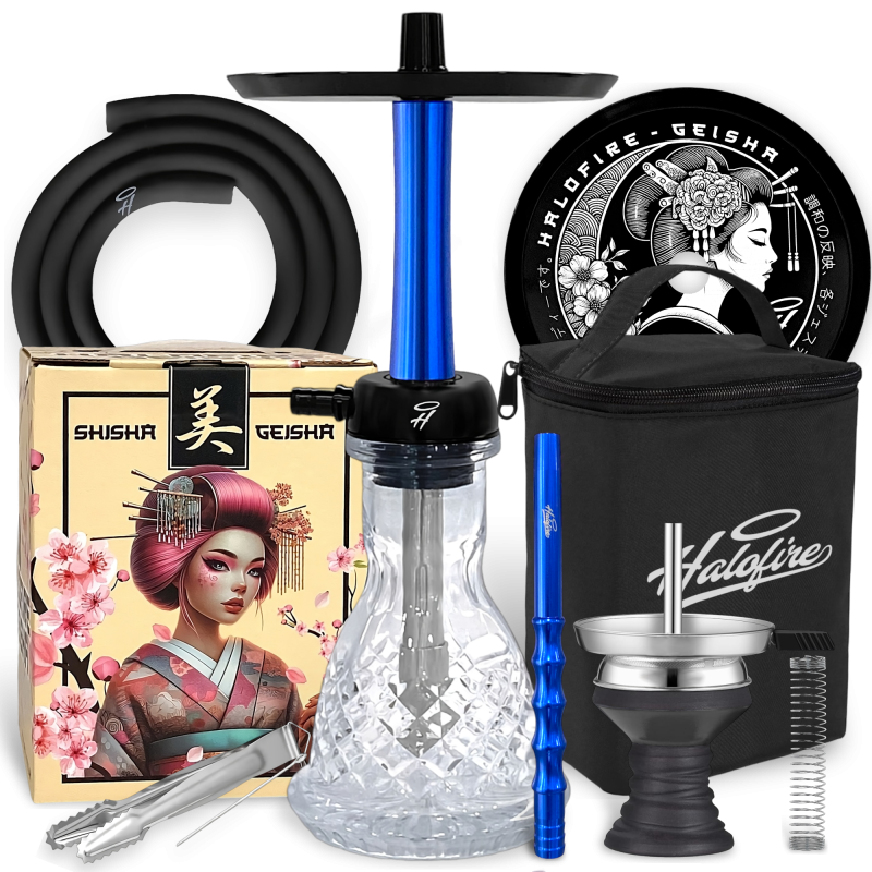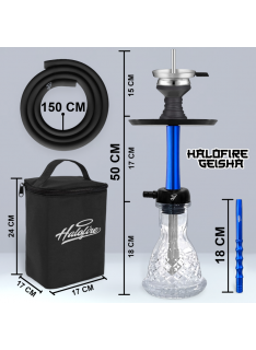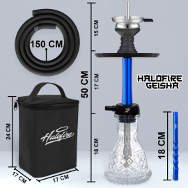 La cachimba Halofire Geisha es una creación de El Templo de la Shisha. Un modelo profesional de 38 cm de altura diseñada para quienes buscan una experiencia de alta calidad a un precio económico. Fabricada en aluminio anodizado y acero inoxidable, garantiza resistencia y durabilidad en cada uso. Su difusor ajustable permite al usuario regular tanto el flujo de humo como el sonido, brindando una experiencia personalizable y de gran comodidad. Su diseño y funcionalidad la hacen ideal para uso profesional o personal, destacándo su reducido tamaño desmontada e ideal para transportarla en su maletín de tela incluído.