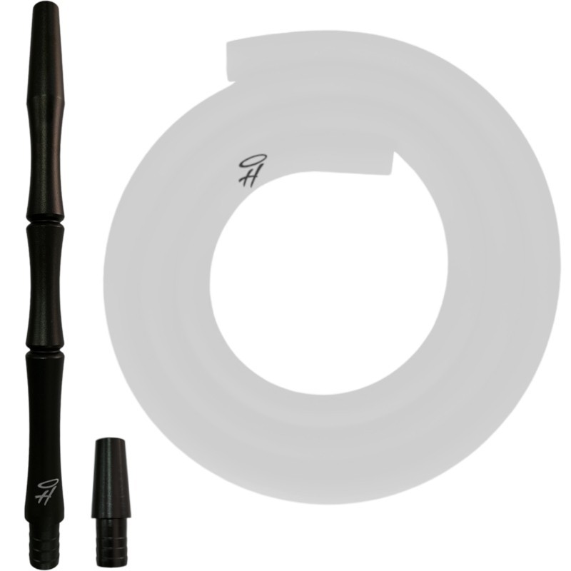 Este set esta compuesto por una boquilla de Aluminio de alta calidad con una estética y un agarre muy cómodoManguera de silicona totalmente lavable de unos 150 cm  y un conector de aluminio para colocarlo en la shisha.